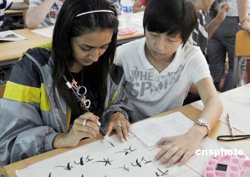 7月24日,正在重慶參加“漢語橋——英國(guó)學(xué)生夏令營(yíng)”的33名英國(guó)中學(xué)生在認(rèn)真學(xué)習(xí)寫漢字!肮Ψ颉薄ⅰ安琛、“瓷器”等富有濃郁中國(guó)傳統(tǒng)文化的字詞,成為他們學(xué)得最快最好的漢字。由英國(guó)兒童學(xué)校和家庭部、中國(guó)國(guó)家漢語國(guó)際推廣領(lǐng)導(dǎo)小組辦公室共同主辦的“漢語橋——英國(guó)學(xué)生夏令營(yíng)”20日在重慶開營(yíng)。中新社發(fā) 郭晉嘉 攝