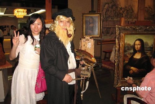 六月三日,蒙娜麗莎文化藝術(shù)館在廣東文化旅游勝地佛山西樵鎮(zhèn)啟幕。該館搜集了來(lái)自近百個(gè)國(guó)家的一千二百余件珍貴藏品,全部藏品都與《蒙娜麗莎》及其作者達(dá)·芬奇相關(guān),歷史跨度近五百年,這是中國(guó)目前唯一一座蒙娜麗莎主題文化藝術(shù)館。圖為游人在藝術(shù)館和裝扮成達(dá)·芬奇的畫(huà)家合影。中新社發(fā) 索有為 攝