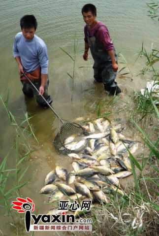 6月3日上午,記者在養(yǎng)殖戶們的魚(yú)池旁看到,工人們正在打撈池中不斷浮出水面的死魚(yú),在此之前,四家養(yǎng)殖戶總共有近10噸的死魚(yú)被拉走,這些魚(yú)只能作為死魚(yú)賤價(jià)銷售,加上未打撈的沉在池底的死魚(yú),總共的損失有幾十萬(wàn)元。