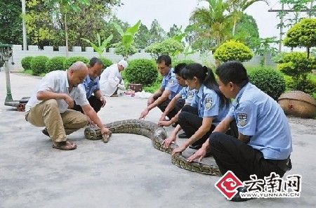 幫巨蟒清洗完身體后,民警當(dāng)場(chǎng)為其體檢:身長(zhǎng)3.7米,腹圍粗為55厘米,重達(dá)25公斤。經(jīng)西雙版納傣族自治州林業(yè)局野生動(dòng)物保護(hù)站獸醫(yī)師許定澤鑒定,這條巨蟒屬于國(guó)家一級(jí)保護(hù)野生動(dòng)物的雌性金花蟒,年齡約20歲左右。根據(jù)蟒蛇約35歲左右的壽命推算,其應(yīng)該正處于盛年期。據(jù)許定澤介紹,這樣大的金花蟒,實(shí)屬罕見(jiàn)。(戴振華 常宗波)