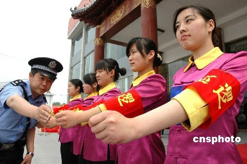 2009年7月9日,山東首支全運(yùn)會(huì)酒店女子巡邏隊(duì)在淄博周村北郊鎮(zhèn)成立。當(dāng)日是第十一屆全國(guó)運(yùn)動(dòng)會(huì)倒計(jì)時(shí)第99天,來自山東淄博周村區(qū)的10名酒店女子在北郊派出所民警的帶領(lǐng)下開始“上崗”巡邏。據(jù)悉,全運(yùn)會(huì)期間,她們除擔(dān)負(fù)酒店周邊治安巡邏任務(wù)外,還負(fù)責(zé)救援受困游客和景區(qū)防火滅火等工作。中新社發(fā) 梁寶海 攝