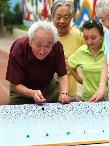 7月11日,在北京安貞社區(qū),一場名為“懷憶童年”的趣味運動會在小區(qū)內(nèi)舉行,滾鐵環(huán)、耍拐、彈球兒、挑棍兒、抽漢奸、打包兒、拍三角等十幾個項目吸引了社區(qū)百余位老年人的熱捧,報名參賽運動員的平均年齡達到了70歲。據(jù)社區(qū)居委會工作人員介紹,懷舊運動會能讓老年人更好的強身健體,更能追憶美好童年。中新社發(fā) 富田 攝