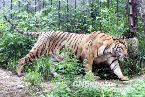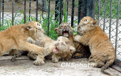 7月20日,在濟(jì)南野生動(dòng)物世界,剛出生2個(gè)月的四胞胎小老虎首次走出產(chǎn)房與游客見面。據(jù)了解,該景區(qū)飼養(yǎng)的孟加拉虎“虎妞”于5月10日產(chǎn)下四胞胎,其中兩只是金虎,一只雪虎,一只孟加拉虎,專家介紹,一胎產(chǎn)下3個(gè)品種的虎崽,在國(guó)內(nèi)還是首次出現(xiàn)。另?yè)?jù)了解,虎有3種基因的顏色,黑色、黃色和白色,其中黑色與黃色是顯性基因,白色為隱性基因,當(dāng)黃色基因不能表達(dá)時(shí),被白色基因掩蓋,就生出白虎,黑色與黃色基因都沒有表達(dá)時(shí),白色基因就成為顯性基因,就生出雪虎,當(dāng)白色與黑色基因變成隱性基因時(shí),就會(huì)生出金黃色的虎,也稱為“金虎”。中新社發(fā) 龔輝 攝