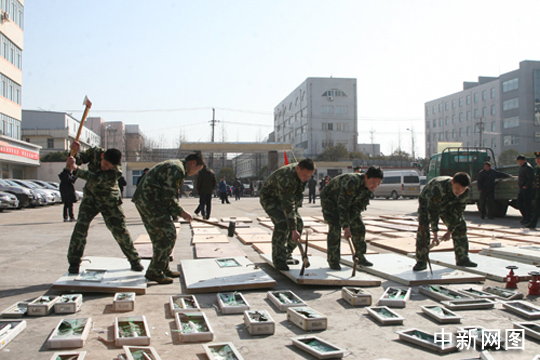 中新網(wǎng)連云港3月10日電 (蘇欣 吳茂新 朱曉穎)10日上午,在連云港市消防支隊(duì)營(yíng)區(qū)院內(nèi),由消防部門(mén)聯(lián)合工商、質(zhì)監(jiān)共同查獲的不合格滅火器、消火栓、消防應(yīng)急照明燈等520余件消防假冒偽劣產(chǎn)品被集中銷毀。