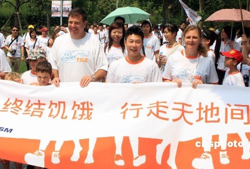 6月7日,由聯(lián)合國(guó)世界糧食計(jì)劃署(WFP)、中國(guó)扶貧基金會(huì)、WFP主要企業(yè)合作伙伴共同舉辦的2009“終結(jié)饑餓——行走天地間”全球慈善義走活動(dòng)(中國(guó)站)在上海舉行。奧運(yùn)冠軍李小鵬(中)應(yīng)邀出席并親身參與了慈善義走活動(dòng),呼吁人們共同抗擊全球范圍內(nèi)的兒童饑餓和營(yíng)養(yǎng)不良問(wèn)題。中新社發(fā) 湯彥俊 攝