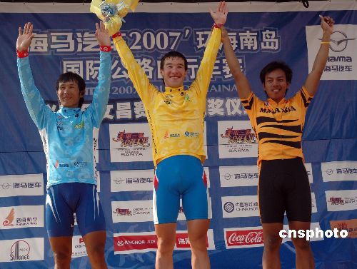 11月5日,“海馬汽車”2007環(huán)海南島國際公路自行車賽舉行第二賽段興隆—文昌賽段。俄羅斯選手(中)丹尼斯·格林姆西亞諾夫蟬聯(lián)個人總成績領先者、沖刺積分領先者兩個獎項,馬來西亞選手阿奴爾·馬南(右)獲得第二賽段分段冠軍,中國國家隊選手馬海軍(左)蟬聯(lián)亞洲最佳選手。中新社發(fā) 彭小云 攝