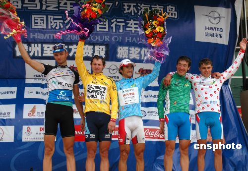 十一月八日,“海馬汽車(chē)”二00七環(huán)海南島國(guó)際公路自行車(chē)賽進(jìn)行第五賽段儋州至東方一百六十八公里的比賽,波蘭隊(duì)四號(hào)車(chē)手羅伯特·仁多士(前左二)獲得本賽段冠軍。中新社發(fā) 尹海明 攝