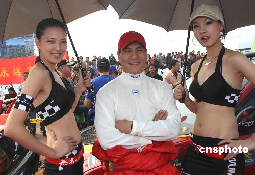 2007年國(guó)際汽聯(lián)亞太汽車?yán)﹀\標(biāo)賽11月9日在浙江龍游拉開(kāi)戰(zhàn)幕,來(lái)自世界的眾多高手及中國(guó)的共計(jì)65部賽車參賽。圖為“中國(guó)第一車手”徐浪(中)新組建的“無(wú)名車隊(duì)”由美女相伴出戰(zhàn)。中新社發(fā) 趙振清 攝