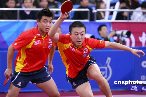12月15日,2007年度國際乒聯職業(yè)巡回賽總決賽在北京大學體育館進入第三個賽日的爭奪。在當日下午進行的一場男雙半決賽中,郝帥/馬龍和王皓/馬琳狹路相逢,經過7局苦戰(zhàn),王皓(左)/馬琳(右)戰(zhàn)勝對手進軍決賽。中新社發(fā) 富田 攝