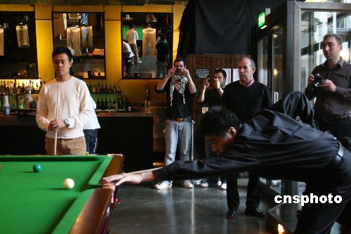 當?shù)貢r間一月九日下午,中國“臺球神童”丁俊暉(擊球者)和香港名將傅家俊(穿白衣者)在倫敦唐人街的一間酒吧“過招”,推廣將在本月十三日開始的溫布利大師賽。中新社發(fā) 李鵬 攝