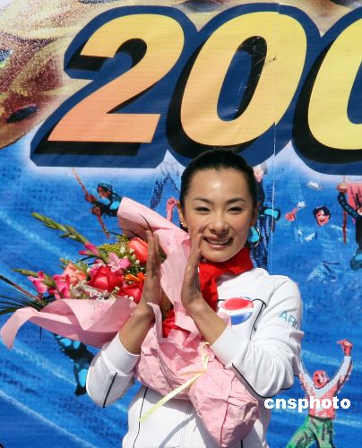1月20日上午,中國(guó)體操世界冠軍劉璇在廣東惠州市帶領(lǐng)上萬市民歡呼齊跳“愛中國(guó),中國(guó)隊(duì)加油!”集體舞。由惠州鵝城攝影學(xué)會(huì)主辦的“2008舞動(dòng)大拇指,最愛中國(guó)年”攝影大賽同時(shí)開始,劉璇親自按動(dòng)相機(jī)快門,主持?jǐn)z影大賽開鏡儀式,并為惠州人民題寫新年祝詞。中新社發(fā) 宋秀杰 攝