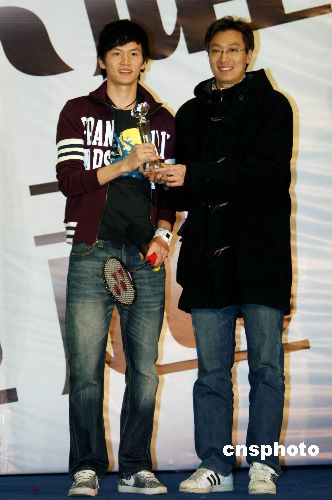 1月29日,北京某品牌服飾請(qǐng)來(lái)潮流天王陳冠希及內(nèi)地知名設(shè)計(jì)師樊小博分別設(shè)計(jì)限量Sports概念Tee。在發(fā)布會(huì)現(xiàn)場(chǎng),主辦方特別邀請(qǐng)了2008年奧運(yùn)金牌有力競(jìng)爭(zhēng)者——羽毛球國(guó)手鮑春來(lái)出席宣傳活動(dòng)。中新社發(fā) 袁方 攝