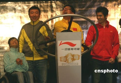 3月22日,“李寧零八中國之旅”活動在北京朝陽公園啟動,該活動將通過“大篷車”巡游的形式,歷時9個月,行程4萬公里,途經(jīng)全國近百座中型城市宣傳奧運(yùn)精神、大屏幕直播北京奧運(yùn)會比賽,并開展三加一籃球挑戰(zhàn)賽等一系列全民健身活動。 圖為前中國體操隊(duì)選手桑蘭(左一)、奧運(yùn)冠軍楊凌(左二)、邢傲偉(左四)等在啟動儀式上。中新社發(fā) 沈晨 攝