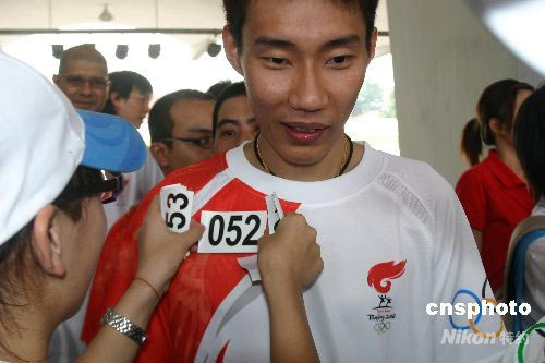 4月21日下午2時(shí),北京奧運(yùn)圣火在吉隆坡的起跑、點(diǎn)火儀式在獨(dú)立廣舉行。北京奧運(yùn)圣火在吉隆坡的傳遞以“從古老到現(xiàn)代”為主題,從獨(dú)立廣場(chǎng)出發(fā)后,途徑市政廳、國(guó)家議會(huì)、國(guó)家博物館、國(guó)家清真寺、獨(dú)立體育場(chǎng)、亞洲第一高塔吉隆坡電視塔,最終將于傍晚6時(shí)在國(guó)營(yíng)石油公司雙峰塔舉行慶典儀式。整個(gè)傳遞路線約為16公里,歷時(shí)4個(gè)小時(shí)。圖為明星火炬手、馬來(lái)西亞著名羽毛球運(yùn)動(dòng)員李宗偉貼上52號(hào)標(biāo)簽。 沈晨 攝