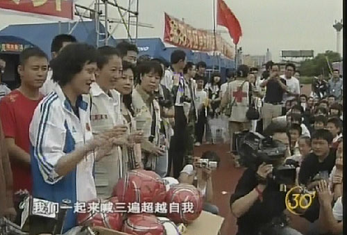 為了讓地震幸存者的心理創(chuàng)傷早日愈合,一支由奧運冠軍組成的特別的心理救援團抵達四川災區(qū)為當地受災民眾帶去心靈的寬慰。圖為在四川綿陽受災群眾安置點,奧運冠軍高敏、楊揚帶著孩子們高呼“超越自我”。