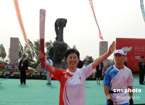 7月10日,奧運火炬開始在著名的紅山文化起源地內蒙古赤峰市進行傳遞。傳遞線路全長6.1公里,起點為車伯爾民俗園。第一棒火炬手為赤峰第一任旅游局局長、全國旅游系統(tǒng)先進個人娜日蘇。 中新社發(fā) 廖攀 攝