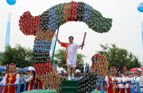 7月10日,奧運火炬在內(nèi)蒙古赤峰市進行傳遞;鹁媸钟诮ㄔO穿過用福娃組成的“玉龍”。在赤峰翁牛特旗出土的紅山文化標志性文物——玉龍,被史學界定為“中華第一龍”。中新社發(fā) 廖攀 攝