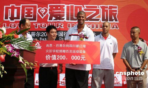 9月1日上午,參加“08中國愛心之旅”的NBA火箭隊球星巴蒂爾,來到四川地震極重災區(qū)都江堰市勤儉人家災民安置點慰問災區(qū)民眾。中新社發(fā) 霍潺 攝