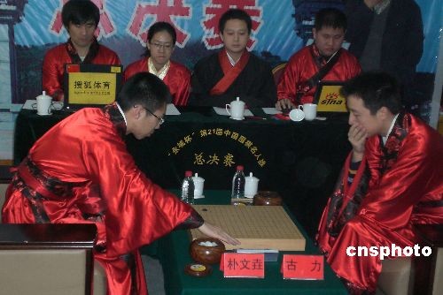 11月19日,“永城杯”第二十一屆中國圍棋名人戰(zhàn)五番棋決賽第四局較量在河南省永城市進(jìn)行,古力九段在“福地”又下一城,執(zhí)黑289手中盤擊敗樸文堯五段,將總比分扳成2比2平,衛(wèi)冕冠軍的希望大增。圖為樸文堯(左)與古力在對局中。中新社發(fā) 沈晨 攝