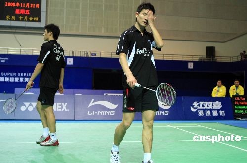 11月21日,在上海進(jìn)行的2008年中國羽毛球公開賽男雙1/4決賽中,中國頭號(hào)男雙組合蔡赟/傅海峰以1比2不敵跨國組合陳甲亮/吳俊明無緣四強(qiáng),三局的比分為17比21、21比19和21比18。中新社發(fā) 湯彥俊 攝