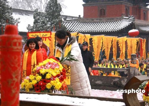 2月26日上午, 以“千年古廟會,萬姓拜羲皇”為主題的2009年中國·淮陽羲皇故都朝祖會在羲皇故都——河南淮陽舉行。奧運會冠軍及金牌獲得者高敏、陳中、郭文珺、陸春龍、張湘祥、陸永、鄒市明、殷劍、楊秀麗等,參加朝祖會。圖為陳中向人文始祖伏羲敬獻(xiàn)花籃。中新社發(fā) 王中舉 攝