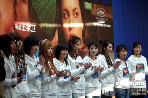 十一月二十一日,王家衛(wèi)聯(lián)合女性交友網(wǎng)站愛情公寓在北京長城腳下公社舉辦新聞發(fā)布會,通過愛情公寓征選的十位藍莓女孩集體亮相,他們還將搭乘藍莓巴士進行為期一個月,走遍全國十個城市的旅程,女孩將會在愛情公寓網(wǎng)站中上傳每日旅行日記照片,最終由網(wǎng)友票選一位最具有藍莓精神的藍莓天使。片方希望通過這種形式宣傳,讓電影里的情節(jié)在生活中同樣可以實現(xiàn),并讓這十位藍莓女孩也有機會體會諾拉瓊斯在電影里的感情旅程。中新社發(fā) 廖攀 攝