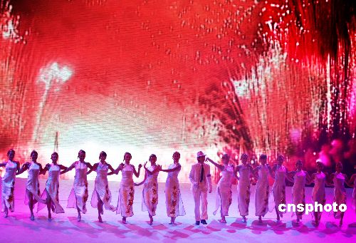 中國中央電視臺2008元旦雙語(漢語、英語)晚會,12月31日晚在北京歡樂谷華僑城大劇院隆重舉行,中央電視臺國際頻道向全世界實況直播。晚會除中國演員外還有日本、韓國、泰國、馬來西亞、新加坡、印度等國家的藝術家登場獻藝,通過歌曲、舞蹈、雜技、魔術、服裝秀、戲曲等藝術形式,向全球華人送去新年祝福。中新社發(fā) 宋吉河 攝