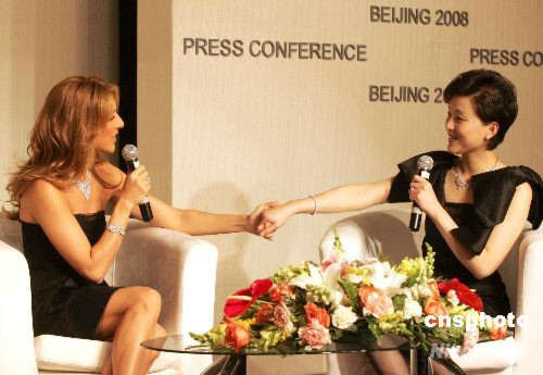 4月12日,國際歌壇天后席琳·迪翁與中國好友楊瀾在北京與記者見面,介紹她們聯(lián)手打造的頂級鉆石品牌HV Love。席琳·迪翁曾在榮獲奧斯卡多項大獎的影片《泰坦尼克號》中擔(dān)任主唱。中新社發(fā) 張宇 攝