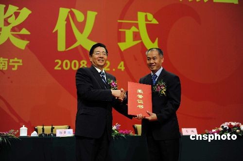 十二月四日,中共廣西壯族自治區(qū)委員會、廣西壯族自治區(qū)人民政府授予著名導演張藝謀“廣西杰出貢獻獎”,獎勵一百萬元人民幣。中新社發(fā) 蔣雪林 攝