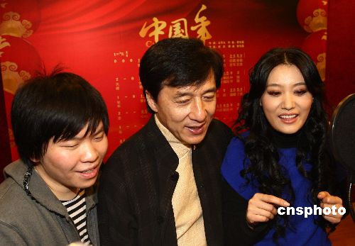 1月8日,成龍在北京樂家軒與譚晶(右)、常石磊共同錄制賀歲歌曲《中國年》。這首《中國年》由王久平作詞,常石磊作曲,由成龍、譚晶、常石磊演唱,曲風溫暖快樂。成龍說,雖然在這一年里有歡喜有悲傷,但也讓我們感受到更多溫暖的一年,希望用歌聲為2008年劃上句號,給大家傳遞美好的祝福。中新社發(fā) 杜洋 攝