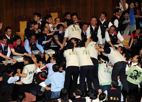 中新網(wǎng)7月11日電 綜合消息,臺灣“立法院”臨時會8日審議ECFA(兩岸經(jīng)濟合作框架協(xié)議),由于民進(jìn)黨暴力阻撓表決,現(xiàn)場爆發(fā)肢體沖突,國民黨“立委”吳育升被砸傷眼角,民進(jìn)黨“立委”郭玟成攀爬主席臺時摔落。據(jù)臺灣《聯(lián)合報》報道,民進(jìn)黨“立院”黨團(tuán)總召柯建銘、新任干事長管碧玲,昨到高雄市立民生醫(yī)院探視受傷“立委”郭玟成,院方表示,郭有三根肋骨骨折。