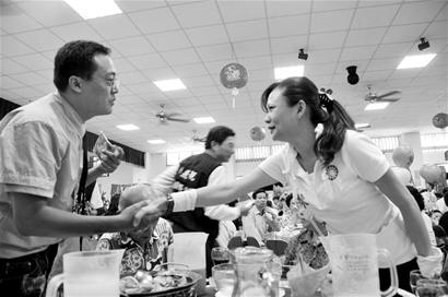 給記者記憶深刻的是,一直在我們身邊默默坐著的一對(duì)盛裝夫婦,他們?nèi)胱缶湍,吃了兩三樣菜后,突然聽到司儀說:“請(qǐng)郭添財(cái)?shù)娜!蔽疑磉叺钠炫叟繋е⑿,款款走上舞臺(tái),拿起話筒開始說著洋洋灑灑的祝福語,然后話鋒一轉(zhuǎn):請(qǐng)給專業(yè)、認(rèn)真、負(fù)責(zé)的郭添財(cái)博士一個(gè)機(jī)會(huì),給我們支持,好不好!我這才反應(yīng)過來,身邊這對(duì)夫婦竟然是大臺(tái)南市長(zhǎng)候選人郭添財(cái)?shù)娜缛9胰┲v完后,回到我們這一圓桌,舉杯和我們喝了口酒,然后從包里拿出郭添財(cái)?shù)拿纸o同桌的人,名片上包括郭添財(cái)?shù)膫(gè)人照片、從政簡(jiǎn)介、競(jìng)選口號(hào)和各種聯(lián)絡(luò)方式。分完名片,說完拜托的話,他們就站起來說:“我們要先走了,還要去趕下一場(chǎng)!
