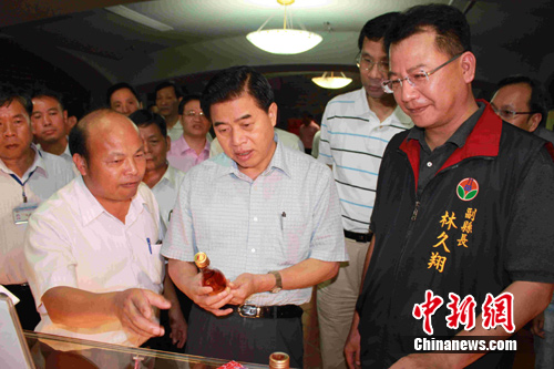 中新網(wǎng)苗栗8月19日電 廣東省省長黃華華率領(lǐng)的廣東經(jīng)貿(mào)文化交流團(tuán)主圖19日從新竹抵達(dá)苗栗縣參觀訪問。黃華華在當(dāng)?shù)仡I(lǐng)導(dǎo)人的陪同下參觀了農(nóng)莊、當(dāng)?shù)靥禺a(chǎn)銷售商場。當(dāng)看到當(dāng)?shù)赜貌葺庸ぶ圃斓牟葺称妨宅槤M目,充滿貨架時大為贊賞,稱贊苗栗“了不得”。圖為黃華華在苗栗領(lǐng)導(dǎo)人的陪同下,觀看正在發(fā)售中的草莓酒。
