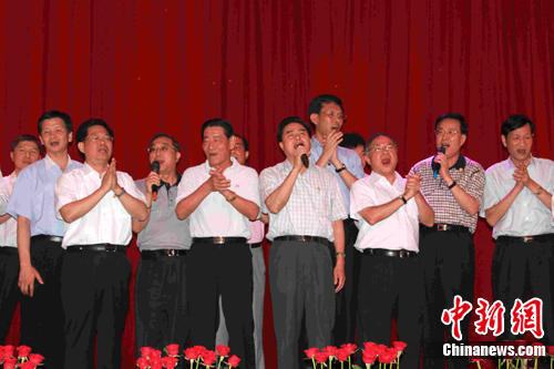 中新網(wǎng)臺(tái)南8月22日電 廣東省省長(zhǎng)黃華華率領(lǐng)的廣東經(jīng)貿(mào)文化代表團(tuán)21日在臺(tái)南訪問。圖為21晚黃華華與廣東省其他隨訪官員與臺(tái)灣奇美實(shí)業(yè)股份有限公司董事長(zhǎng)廖錦祥等公司負(fù)責(zé)人及員工聯(lián)歡,登臺(tái)合唱一曲《愛拼才會(huì)贏》,表達(dá)了兩岸合作拼搏共創(chuàng)輝煌的共同愿望。 中新社記者 張傳熙 攝影
