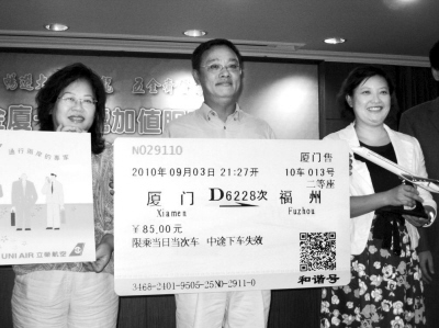 “11年前我就是搭第一班‘小三通’輪船去福州,今天(9月3日)又在臺灣買到了第一張動車火車票,真是感慨萬分。我上次回福州還要自己在廈門排隊買車票,這次就不用了,真是太方便啦!3日上午,福州臺商張鳴齡先生興奮地從臺灣三菱旅行社總經理周惠全手里接過車票模型,宣告大陸動車車票在臺灣正式開賣。