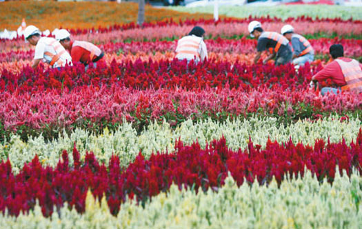 中新網(wǎng)10月9日電 據(jù)臺(tái)灣《聯(lián)合報(bào)》報(bào)道,今天是臺(tái)北花博會(huì)開放測(cè)試第一天,圓山公園展區(qū)最大賣點(diǎn)之一正是面積超過七公頃的花海。超過625萬株花卉“一波未平一波又起”分布展區(qū)各處,不論是花卉種類、栽種密集度及面積都稱霸花博四大展區(qū),其中地景花海及爭(zhēng)艷館的“七道彩虹”最值得一看。
