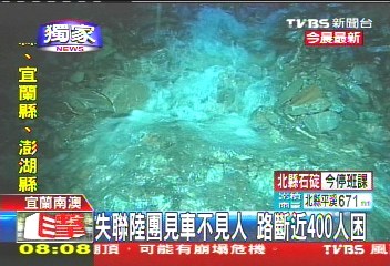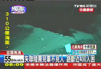 中新網(wǎng)10月22日電 據(jù)臺灣TVBS報道,宜蘭大淹水,蘇花公路更是處處坍方,甚至傳出有大陸游客團的游覽車受困。該媒體記者挺進現(xiàn)場,只看到游覽車空車,人員不知去向,不知是否平安;臺九線大約115公里處,部分路段的路基完全被淘空,土石滑落一兩百米的山下,附近路面更變成小溪、不斷淹水。