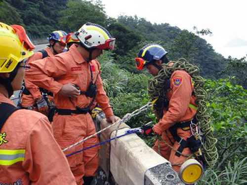 歷經(jīng)40分鐘路程,來到116公里處,前方已一大片塌方,無法再向前。不到片刻,一群身穿橘衣、步伐整齊的臺北市搜救隊朝這走來。在短暫的集合、下達(dá)指令后,搜救隊員系著繩索,一個接著一個從路邊護(hù)欄緩緩垂降,搜索生還者及車輛殘骸。