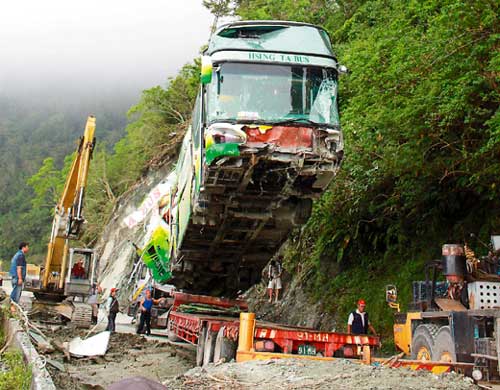 據(jù)報(bào)道,這輛車(chē)嚴(yán)重變形,車(chē)頭還掛有浙江團(tuán)的名牌,由于車(chē)內(nèi)塞滿土石,工人用鐵鍬從破損的車(chē)窗挖除土石,輪胎放氣,還出動(dòng)推土機(jī)幫吊起的游覽車(chē)喬位置,花了半個(gè)小時(shí),才順利把游覽車(chē)拖運(yùn)下山。