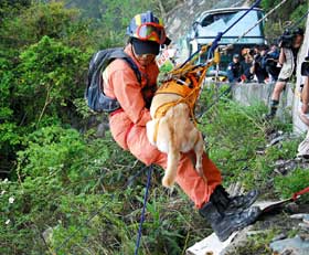 臺北縣搜救隊(duì)副隊(duì)長吳宏益說,前天帶來的兩只搜救犬,由隊(duì)員抱著垂降兩、三百米執(zhí)行搜救,但狗兒過度驚慌,加上斜坡至少七十度,狗兒嚇得連站都站不穩(wěn),“一緊張,就發(fā)揮不了功能,今天就不帶出門了”。