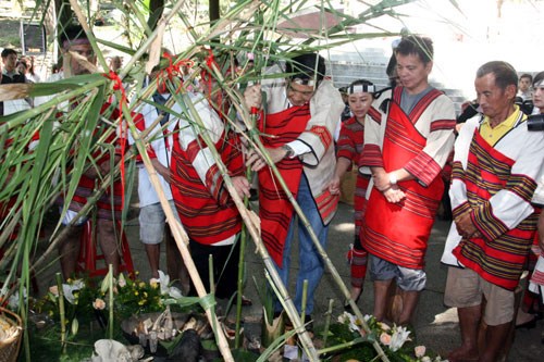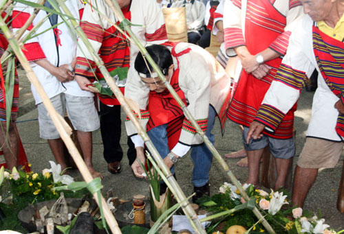 霧社事件27日屆滿80周年,南投縣以賽德克族傳統(tǒng)儀式舉辦祭典活動(dòng),馬英九(前右3)到場主祭,并插竹召喚祖靈。圖片來源:“中央社”