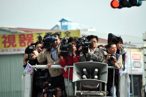 新北市長(zhǎng)選舉進(jìn)入倒數(shù)計(jì)時(shí),選舉結(jié)果牽動(dòng)藍(lán)綠版圖消長(zhǎng),媒體攝影記者隨車隊(duì)采訪掃街,鏡頭不放過(guò)每一個(gè)畫面。但擠在臨時(shí)充當(dāng)采訪車的貨車上采訪,相當(dāng)辛苦與危險(xiǎn)。 “中央社”圖