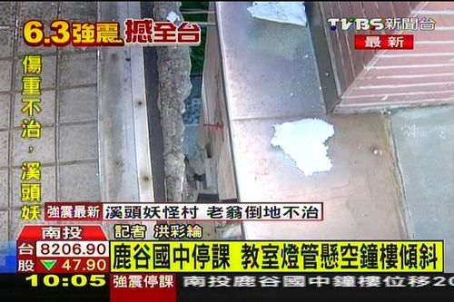 中新網(wǎng)6月3日電 據(jù)臺(tái)灣TVBS網(wǎng)站報(bào)道,6月2日13時(shí)43分,臺(tái)灣南投縣(北緯23.9度,東經(jīng)120.9度)發(fā)生6.7級(jí)地震(臺(tái)灣島內(nèi)氣象部門(mén)測(cè)定為6.3級(jí)),震源深度9.0公里。南投鹿谷中學(xué)也受到地震影響,校園內(nèi)多處毀損,3日停課一天。
