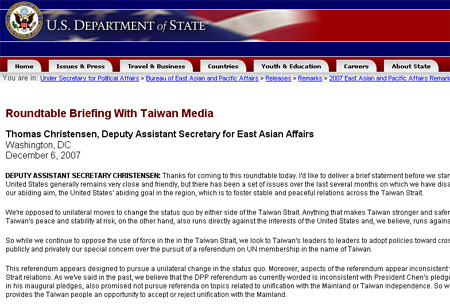 中新網(wǎng)12月13日電 美國國務(wù)院近來不斷高分貝表達(dá)對民進(jìn)黨“入聯(lián)公投”的不悅,也立即公布包括亞太事務(wù)副助理國務(wù)卿柯慶生日前與臺灣媒體記者會(huì)的全文。