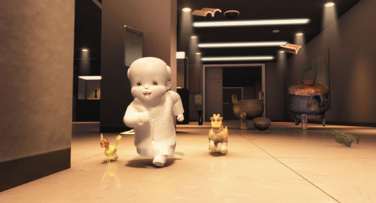 《國寶總動(dòng)員》是臺北“故宮”近來推動(dòng)創(chuàng)新精神的杰作,以兩三年的時(shí)間發(fā)展、完成創(chuàng)作。影片中以“國寶級”文物:嬰兒枕、玉辟邪、玉鴨為主角,尋找從翠玉白菜上飛走的螽斯,在夜半大鬧“故宮”,并在冒險(xiǎn)歷程中逐一結(jié)識五十件“故宮”明星文物。