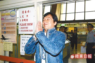 成龍19日傍晚離臺,雙手合十感謝臺灣朋友。(圖:臺灣《蘋果日報(bào)》)