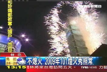堅(jiān)持續(xù)辦煙火,但是受到不景氣影響,本來101大樓應(yīng)該在10月底就該定案決定贊助廠商,但直到現(xiàn)在都找不到贊助人選。2005年101大樓落成,舉辦了88秒的煙火秀,2006、2007則是由國際贊助商Sony舉辦了188秒的煙火秀,今年是交給臺“觀光局”辦理,但到了2009年,“獎落誰家”還是個(gè)未知數(shù)。