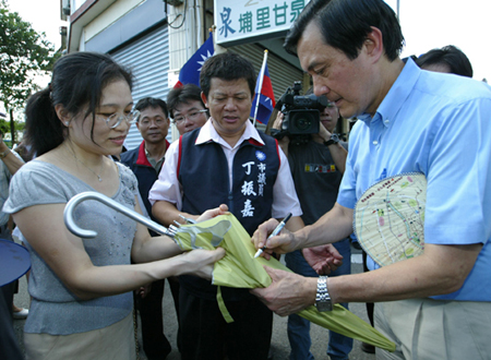 國(guó)民黨2008年“大選”參選人馬英九拜訪基層,熱情民眾拿出雨傘要求簽名,傘尖卻差點(diǎn)戳到小馬哥的“重要部位”,留下這一幅尷尬畫(huà)面。記者丁志寬/攝影