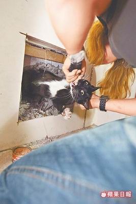 原本協(xié)助救援的照顧生命協(xié)會(huì)與一樓的鞋店商量,企圖敲破墻壁救貓,但店家不愿意,昨因貓咪再度發(fā)出求救聲音,店家心軟同意,消防隊(duì)員及水電工程人員立刻輪番將水泥墻鉆洞,終于救出受困5天的貓咪。