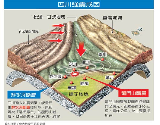 王乾盈說,四川過去百年來發(fā)生的大小地震,只有少數(shù)跟龍門山斷層有關,規(guī)模不大,“以前長時間地震釋放的能量,幾乎都被同在四川的鮮水河斷層消耗掉”,地震專家都以為龍門山斷層的傷口愈合了,不可能再動了。